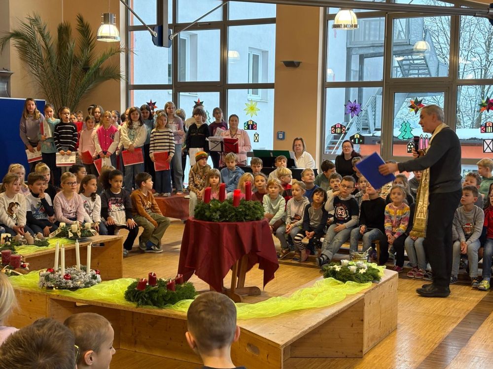 Die heutige Adventskranzsegnung wurde stimmungsvoll von der gesamten Schulfamilie mit dem Lied „Wir sagen euch an den lieben Advent“ eröffnet.