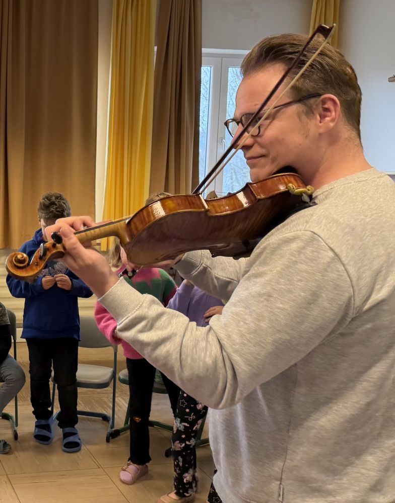 Den Höhepunkt seines Besuches bildete das gemeinsame, schwungvolle Singen der Lieder "Grün, grün, grün" und "Ich lieb das Singen", das von ihm auf seiner Violine begleitet wurde.