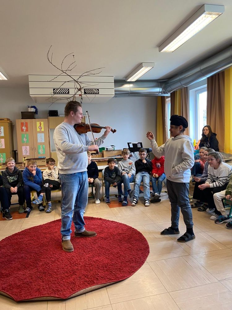 Den Höhepunkt seines Besuches bildete das gemeinsame, schwungvolle Singen der Lieder "Grün, grün, grün" und "Ich lieb das Singen", das von ihm auf seiner Violine begleitet wurde.