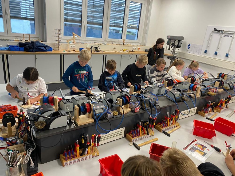 In drei Gruppen wurden Knatterboote und Ventilatoren hergestellt. Die Werkstücke durften die Kinder anschließend mit nach Hause nehmen.
