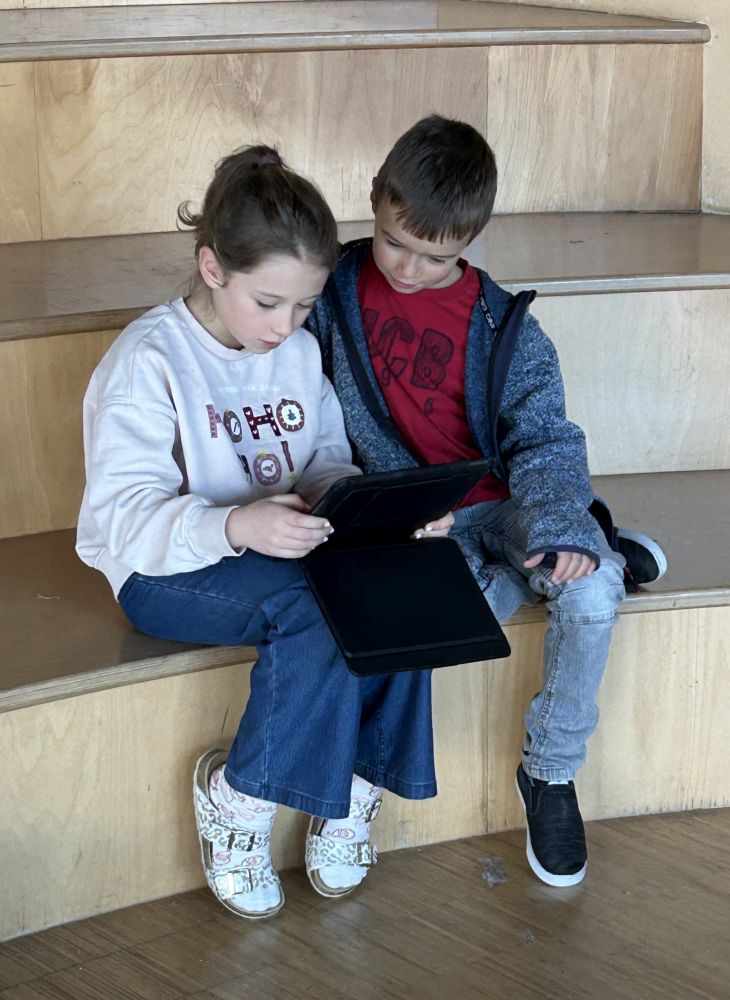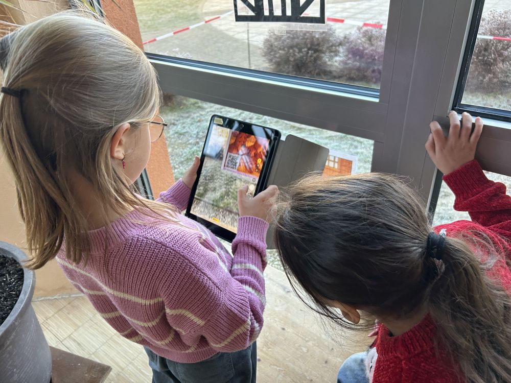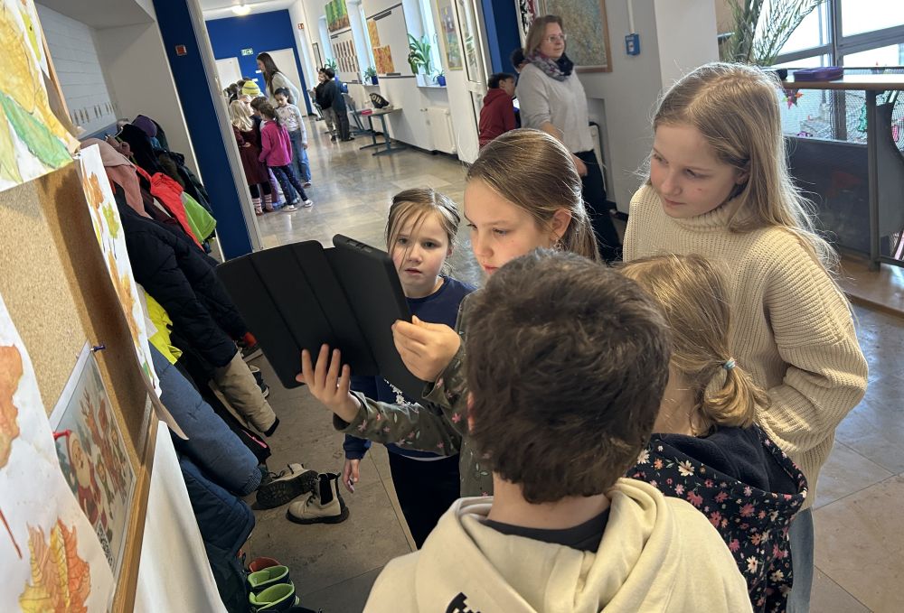 Sie scannten den QR-Code des Startbildes, hörten sich die Strophe an und suchten anhand des Inhaltes das nächste Bild. So ging es weiter, bis die Kinder die letzte und finale Zeichnung erreicht hatten. Abschließend wurde gemeinsam eine weiterführende Aufgabe gelöst, indem in partnerschaftlicher Zusammenarbeit passende Bilder zu den jeweiligen Textabschnitten geklebt wurden.
